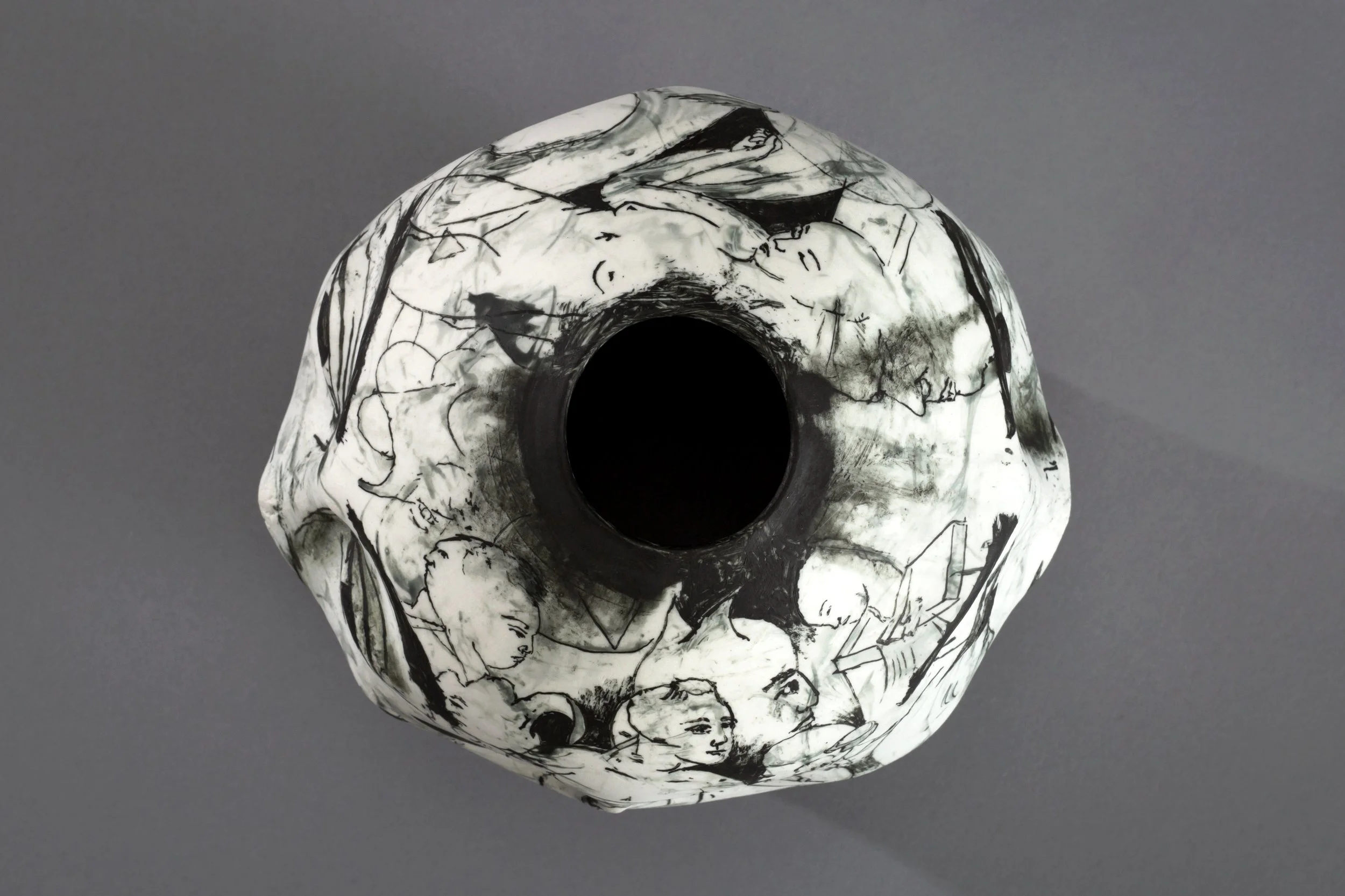 porcelain form with terra sigillata painting and sgraffito detail, 9.5” x 7” x 8.5”, signed 2017